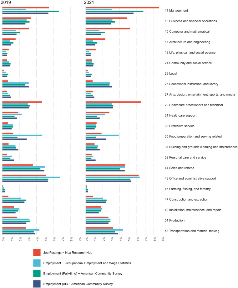 Data from 2019 and 2021 reveal that while “Production” occupations exist, specific percentages for non-durable goods are not segregated. However, job postings indicate demand for various roles that support the consumer goods industry, such as “Sales and related” and “Office and administrative support”.